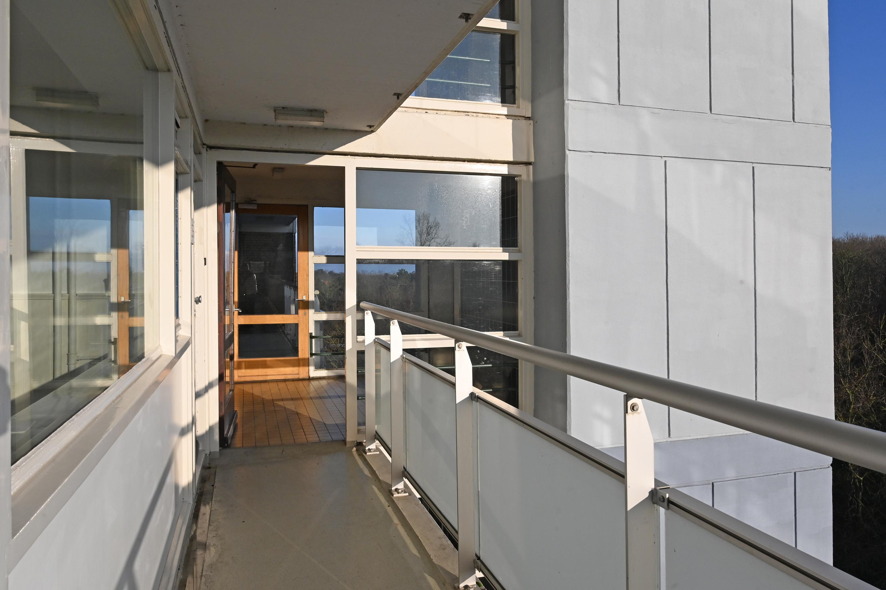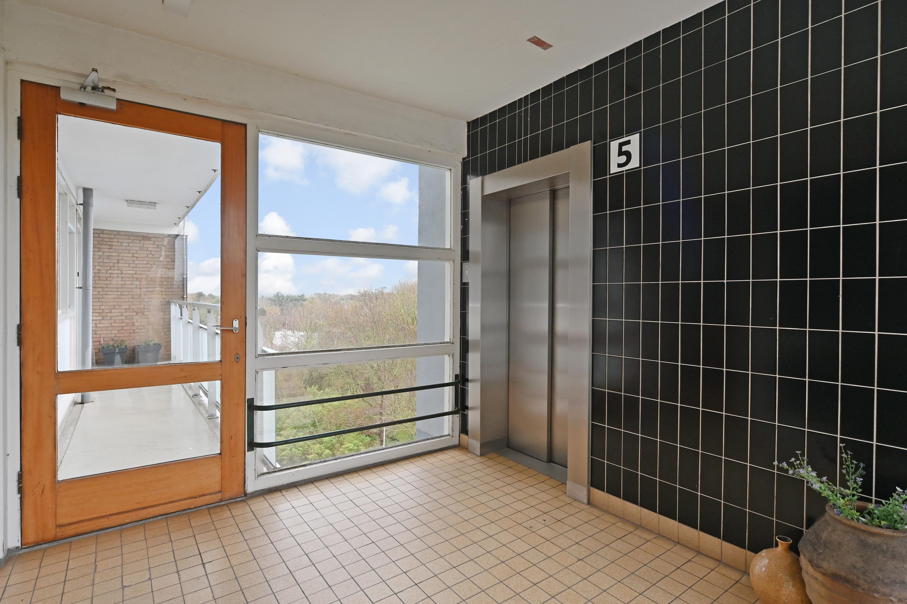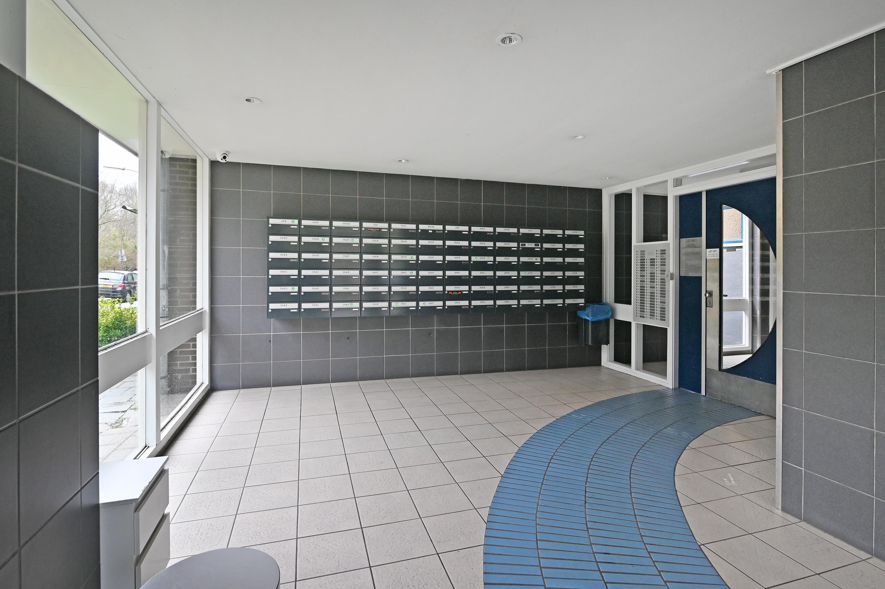Afgesloten entree met bellentableau, brievenbussen, intercominstallatie en toegang tot lift en trappenhuis. Via de galerij op de vijfde etage bereik je de woning.
