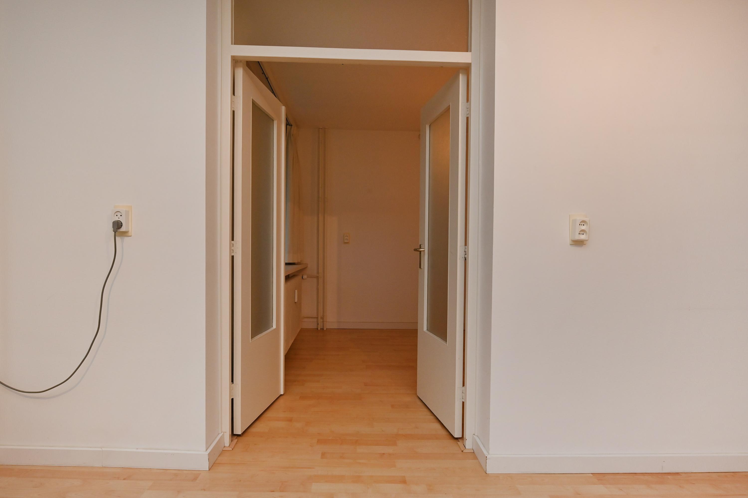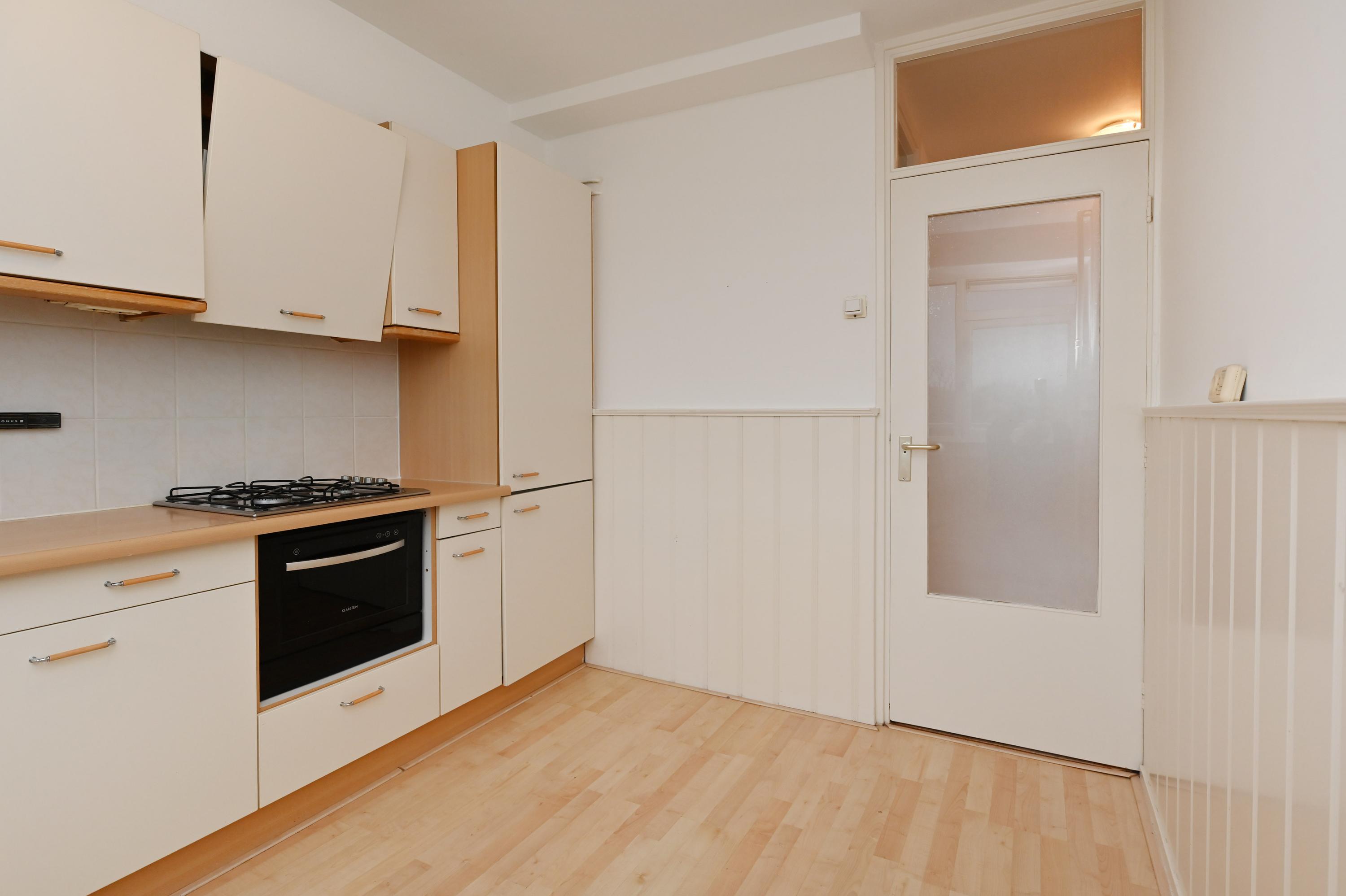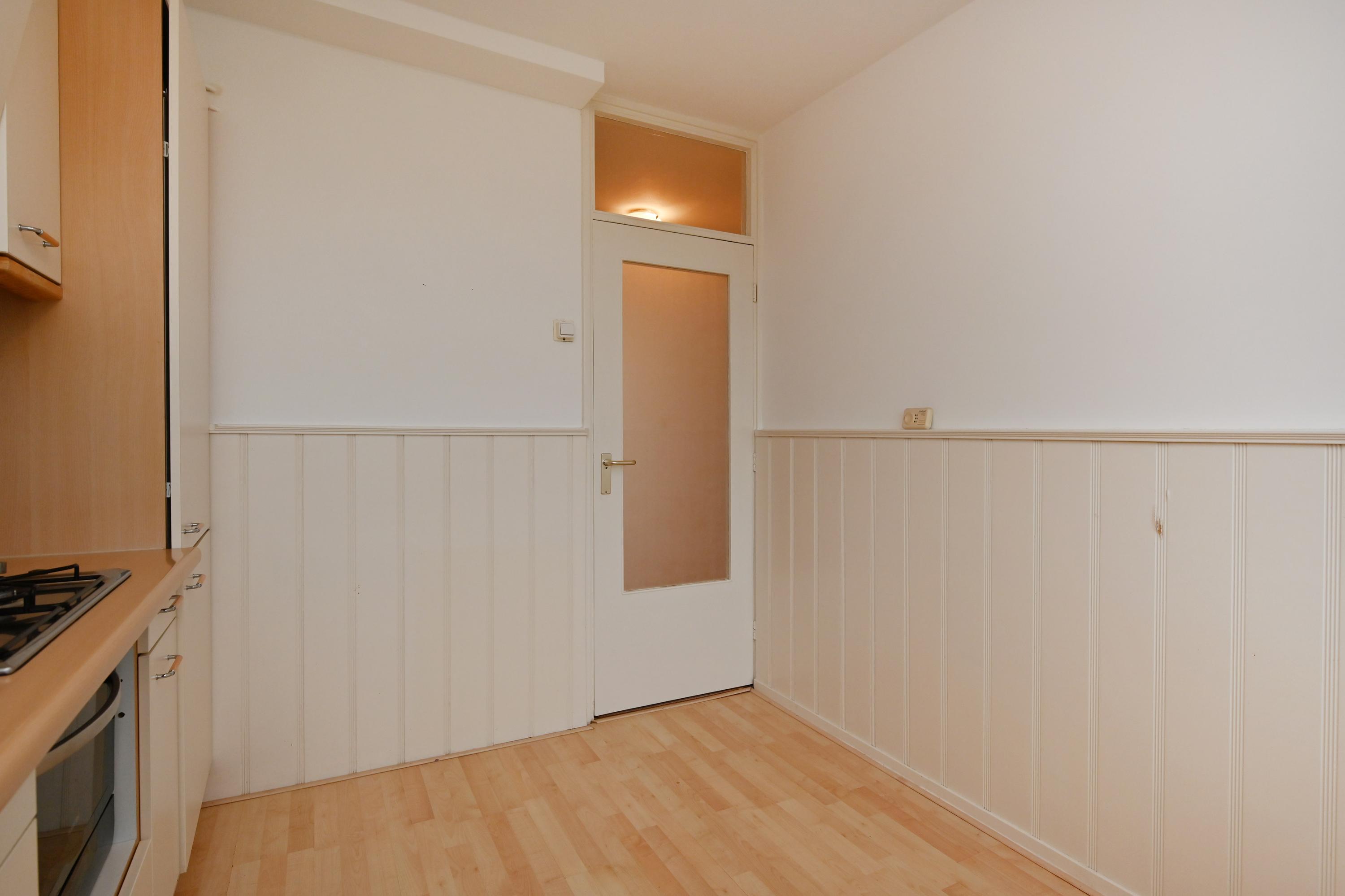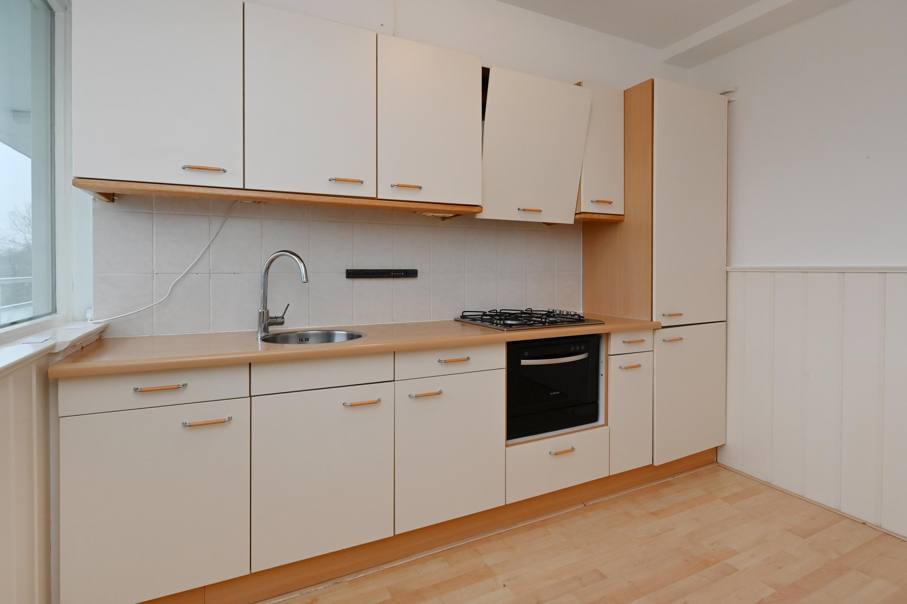 Nette keuken in lichte kleurstelling, voorzien van spoelbak, oven, kleine vaatwasser, koel-vrieskast, vierpits kookplaat, recirculatiekap en voldoende kastruimte. Ook is er plek voor een (klein) eettafeltje. Vanuit de keuken heb je een vrij uitzicht over het groen.
