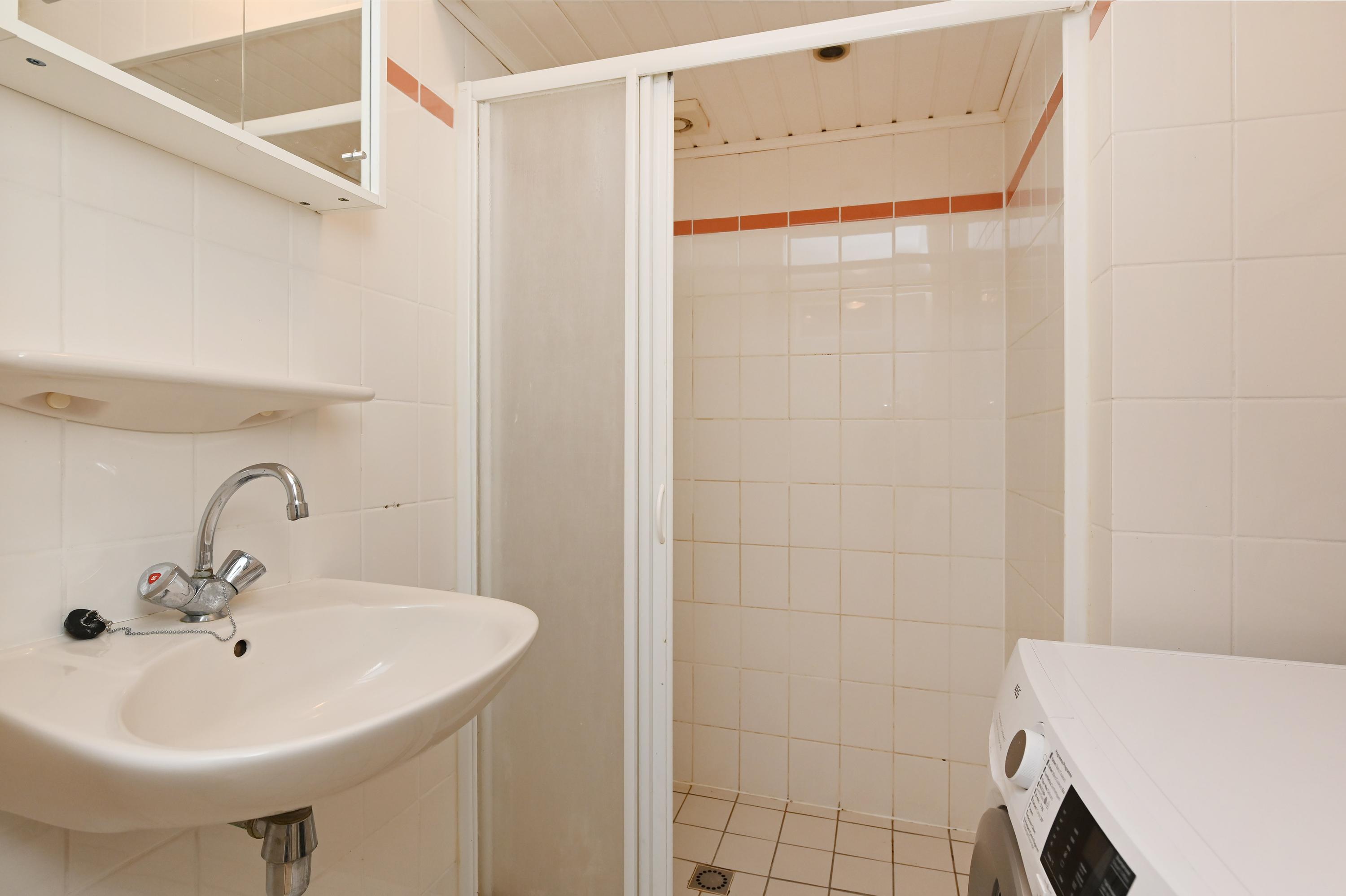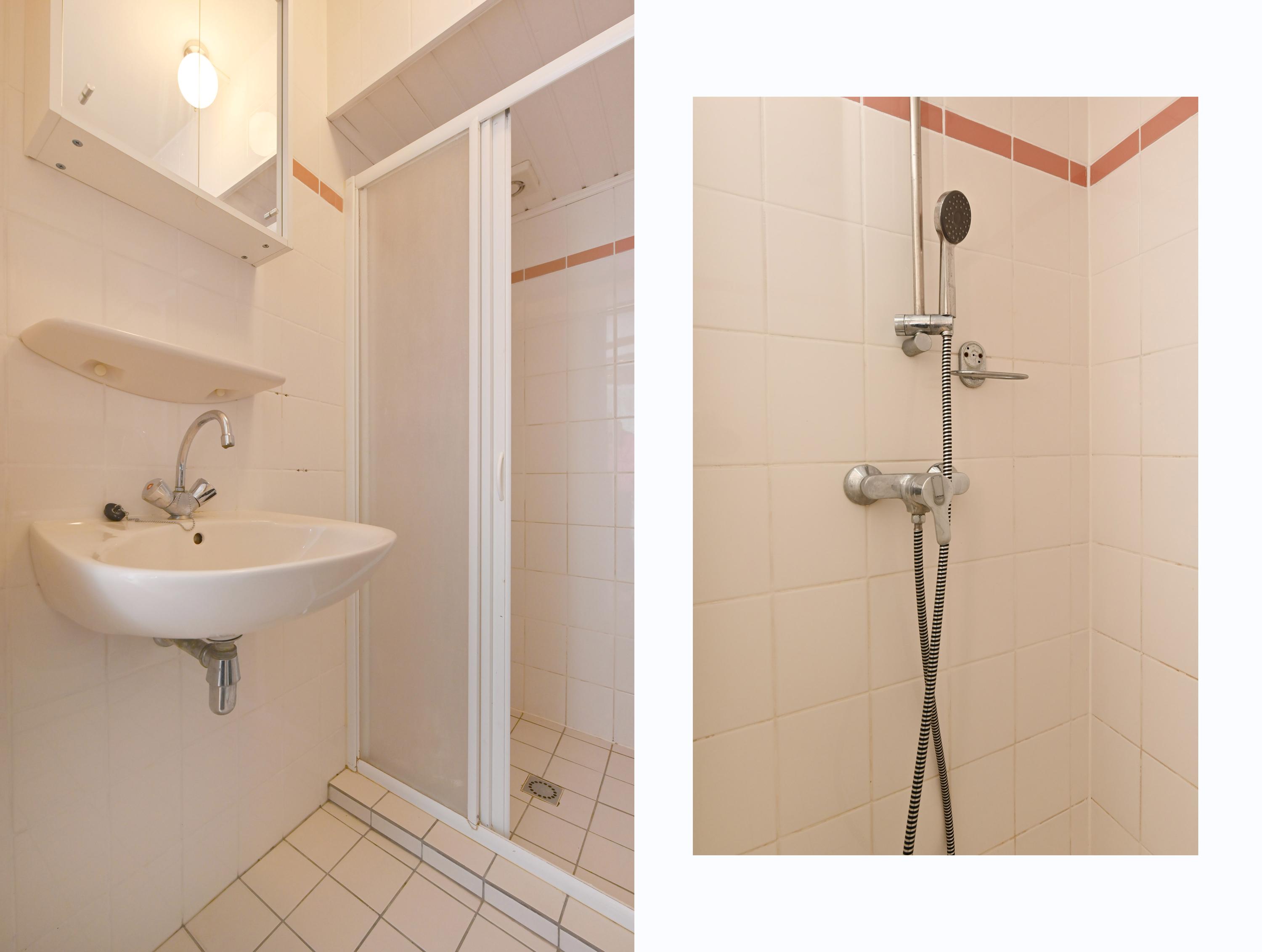 Keurig betegelde badkamer met inloopdouche, wastafel, radiator, ontluchting en wasmachineaansluiting. Separaat toilet met fonteintje.