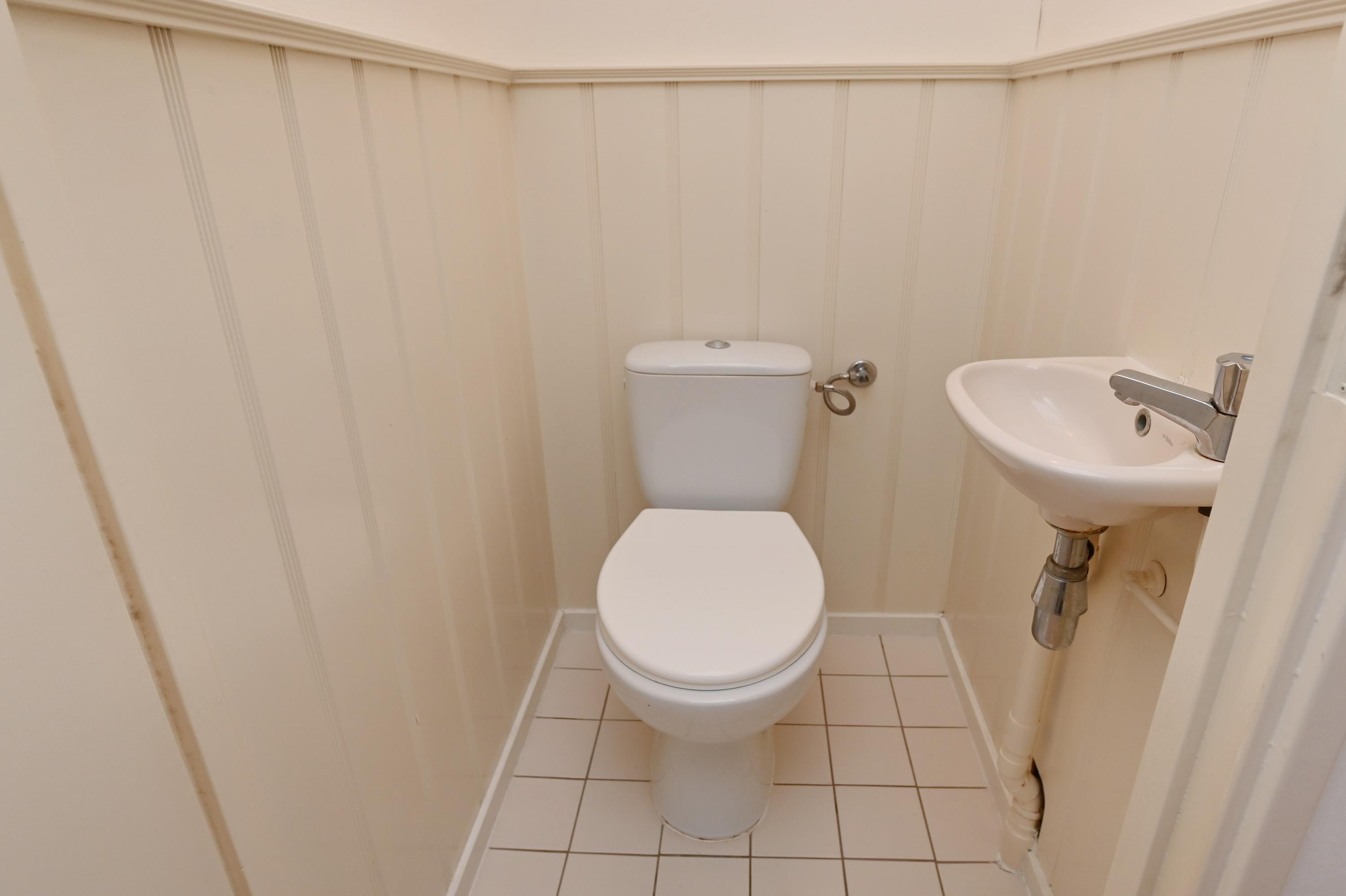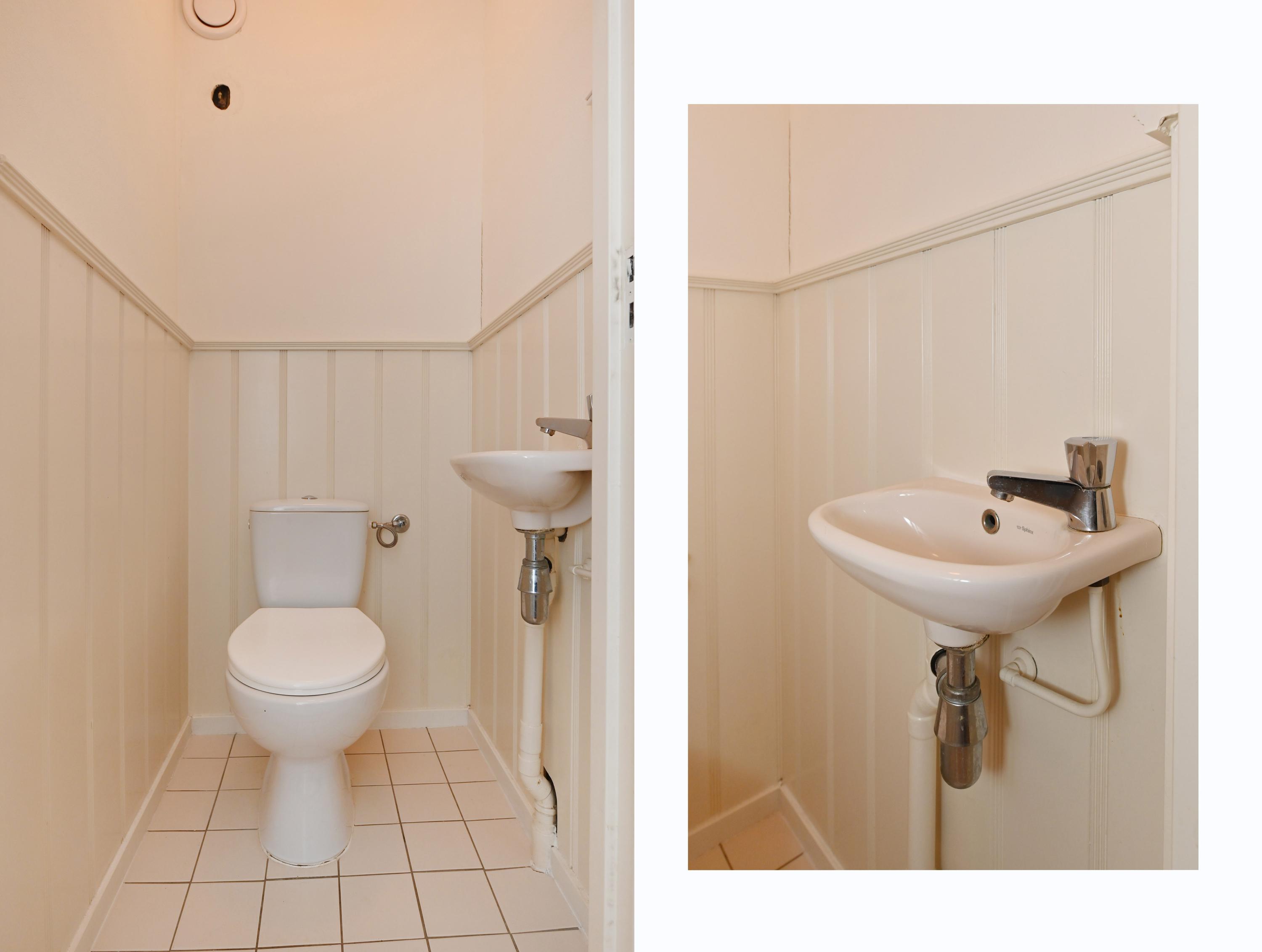 Well-maintained bathroom with walk-in shower, washbasin, radiator, ventilation and washing machine connection. Separate toilet with small washbasin.
