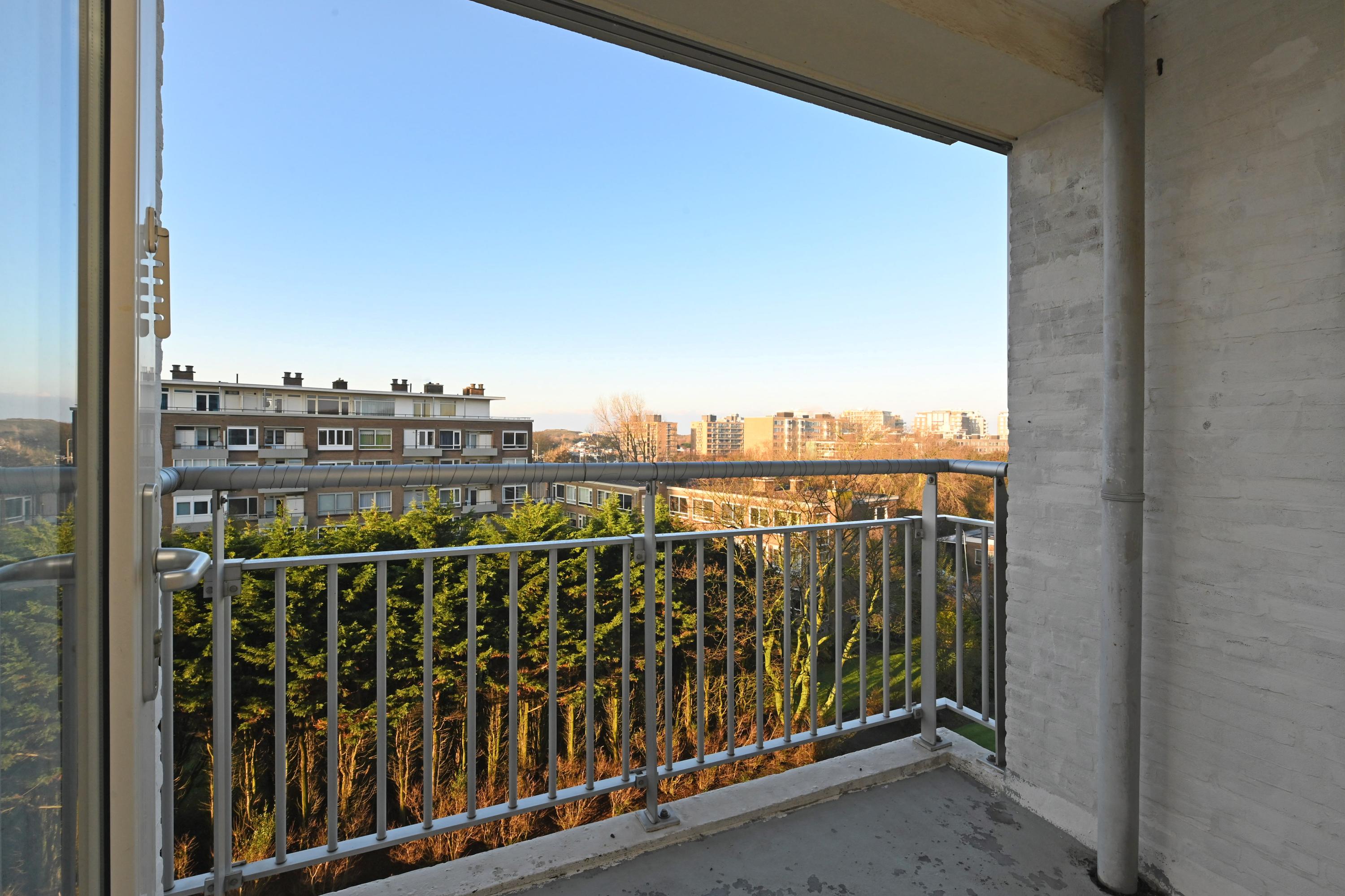 Via openslaande deuren bereik je de ruime slaapkamer, die toegang biedt tot het zonnige balkon (W). Hier kun je heerlijk zitten en genieten van het vrije uitzicht over de duinen en een stukje Kijkduin.