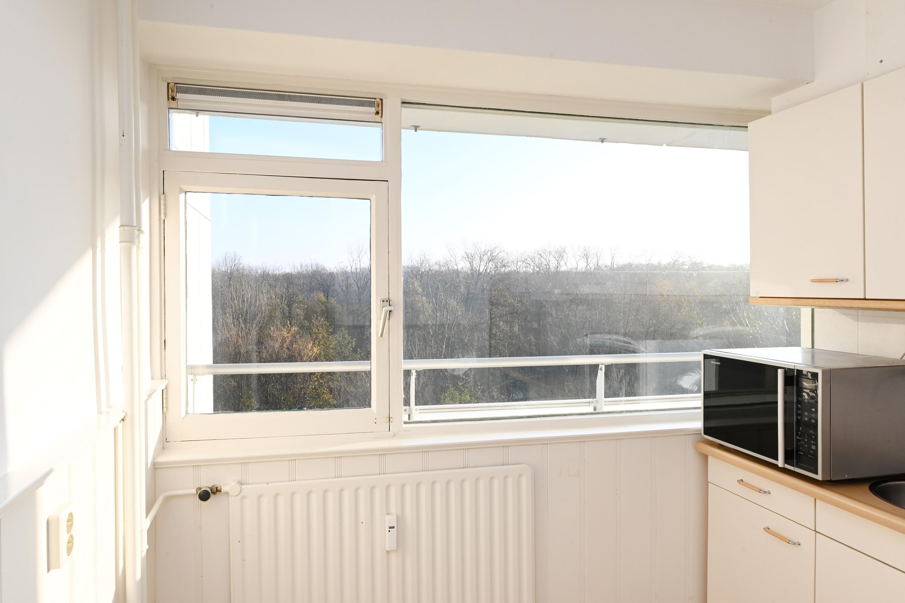 Neat kitchen in a light colour scheme, equipped with sink, oven, compact dishwasher, fridge-freezer, four-burner hob, recirculation hood and ample cupboard space. There is also room for a small dining table. The kitchen enjoys uninterrupted views over the greenery.