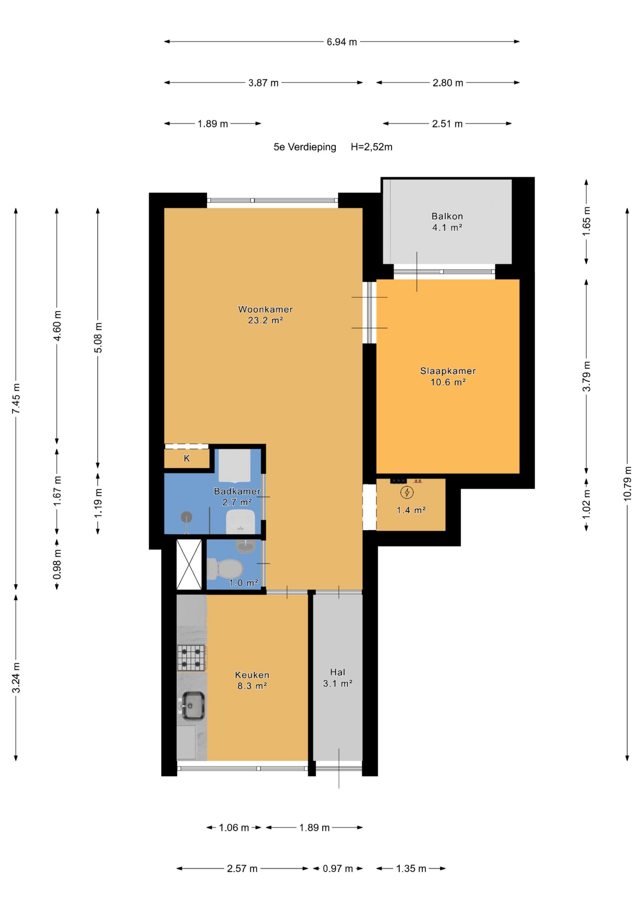 - woonoppervlakte 53,7 m² volgens de branchebrede meetinstructie (afgeleid van de NEN 2580 methode);